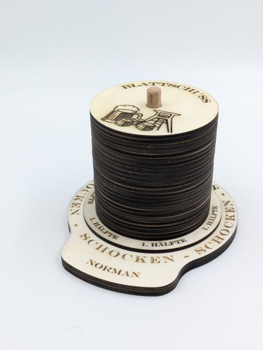 Personalisiertes Schockbesteck aus Holz – 25 oder 13 Gravierte Deckel & Halterung | Trinkspiel | Knobeln | Schocken | Partyzubehör